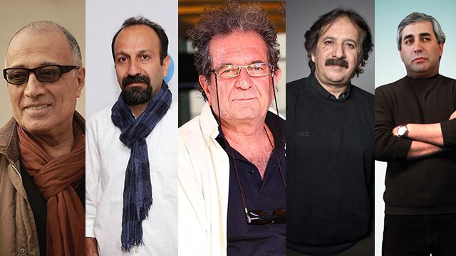 مشاهير السينما الايرانية في المهرجانات السينمائية. من اليمين: إبراهيم حاتمي كيا – مجيد مجيدي – داريوش مهرجوئي – أصغر فرهادي – عباس كيارستمي