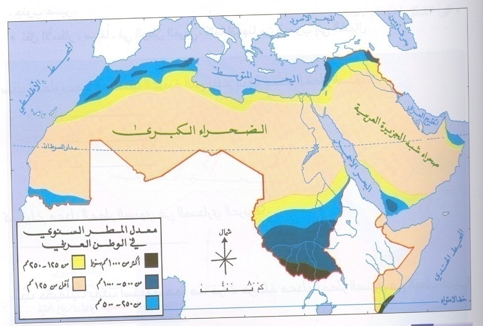 تشمل هذه الأماكن الجنوب السودان، لبنان، الصومال، سوريا، تونس، المغرب، الجزائر، المملكة العربية السعودية، اليمن، فلسطين، العراق، موريتانيا، الأردن، ليبيا، مصر، عمان، الكويت، الإمارات، البحرين، قطر. يتسم هطول الأمطار بغزارة على طول سواحل البحر الأبيض المتوسط وفي المناطق الجبلية، حيث يرتبط بشكل أساسي بأشهر الشتاء.