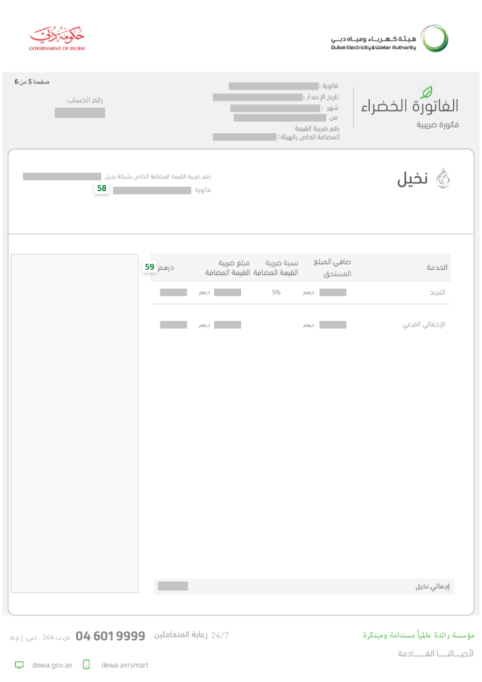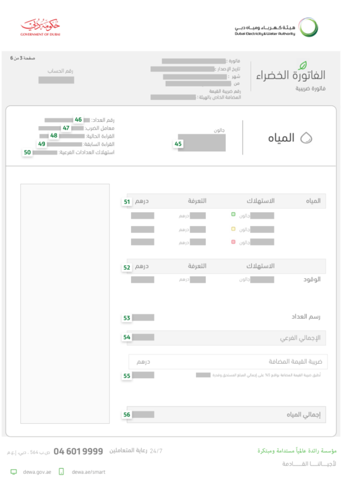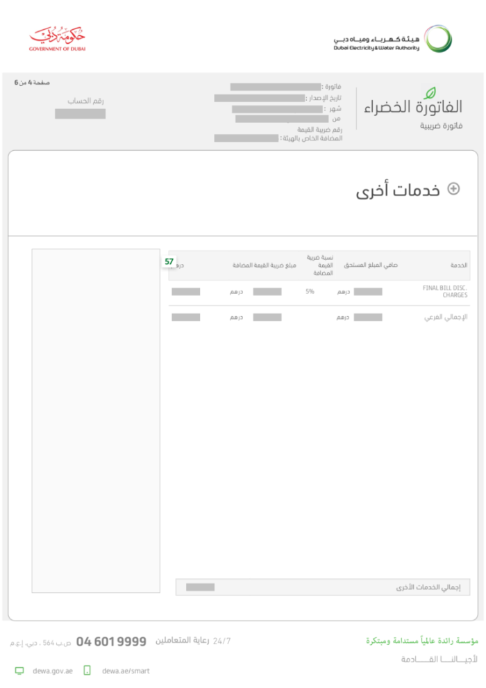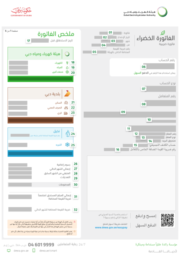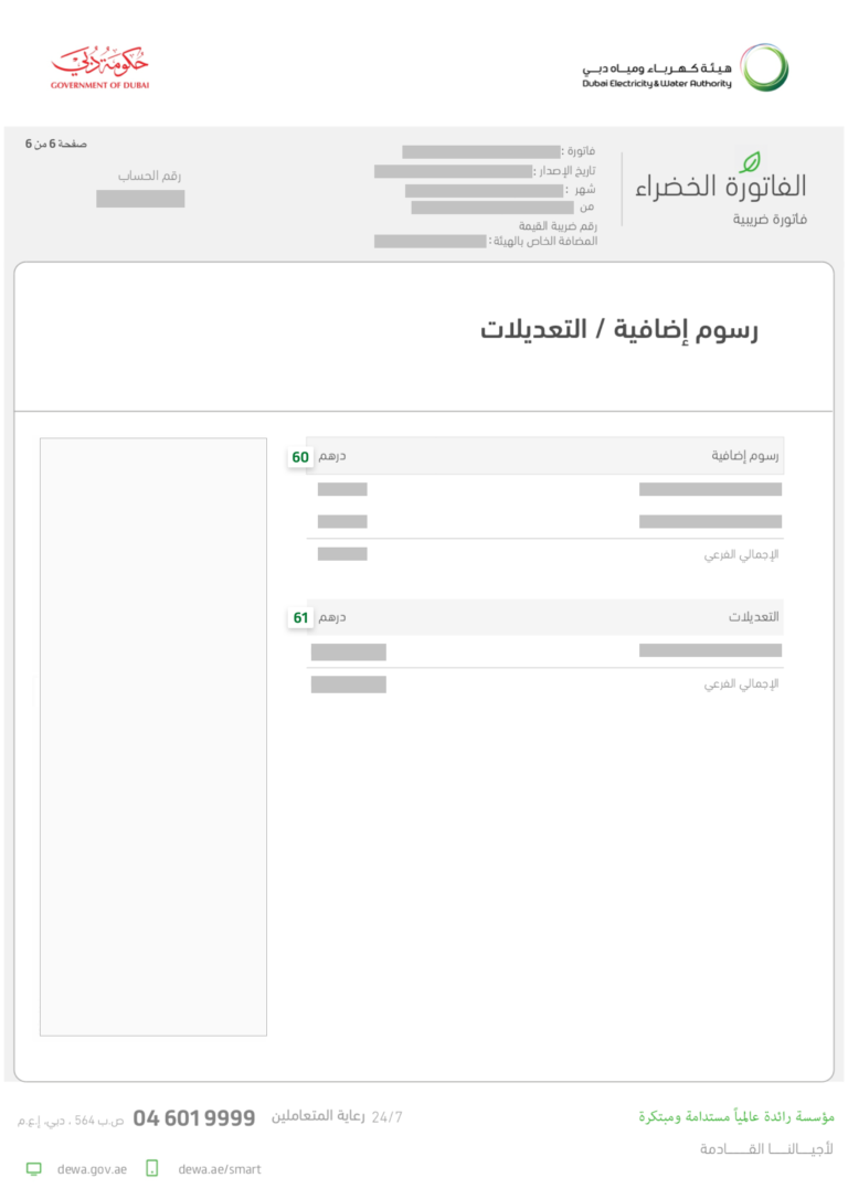 تنقسم فاتورة ديوا إلى 6 صفحات، تحتوي كل واحدة منها على تفاصيل معينة.
