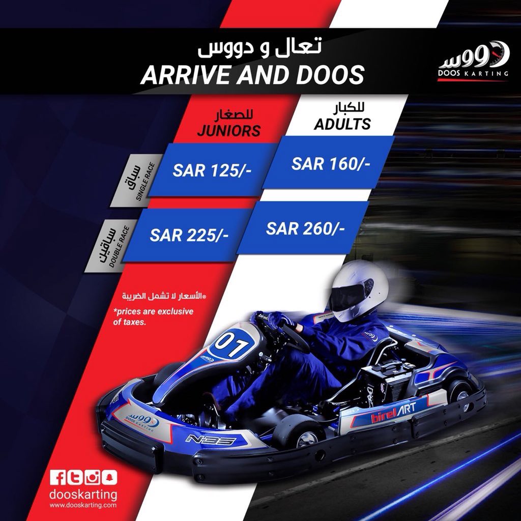 سعر التذكرة المزدوجة لمحبي دووس كارتينج للكبار أو الصغار يصل سعرها إلى175 ريال سعودي فقط.