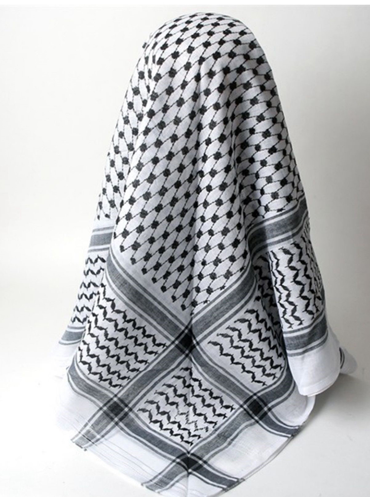 اختيار الكوفية: ابحث عن كوفية فلسطينية بتصميم ولون تفضله. الكوفيات تأتي بألوان وتصاميم مختلفة، ويمكنك الاختيار حسب ذوقك.