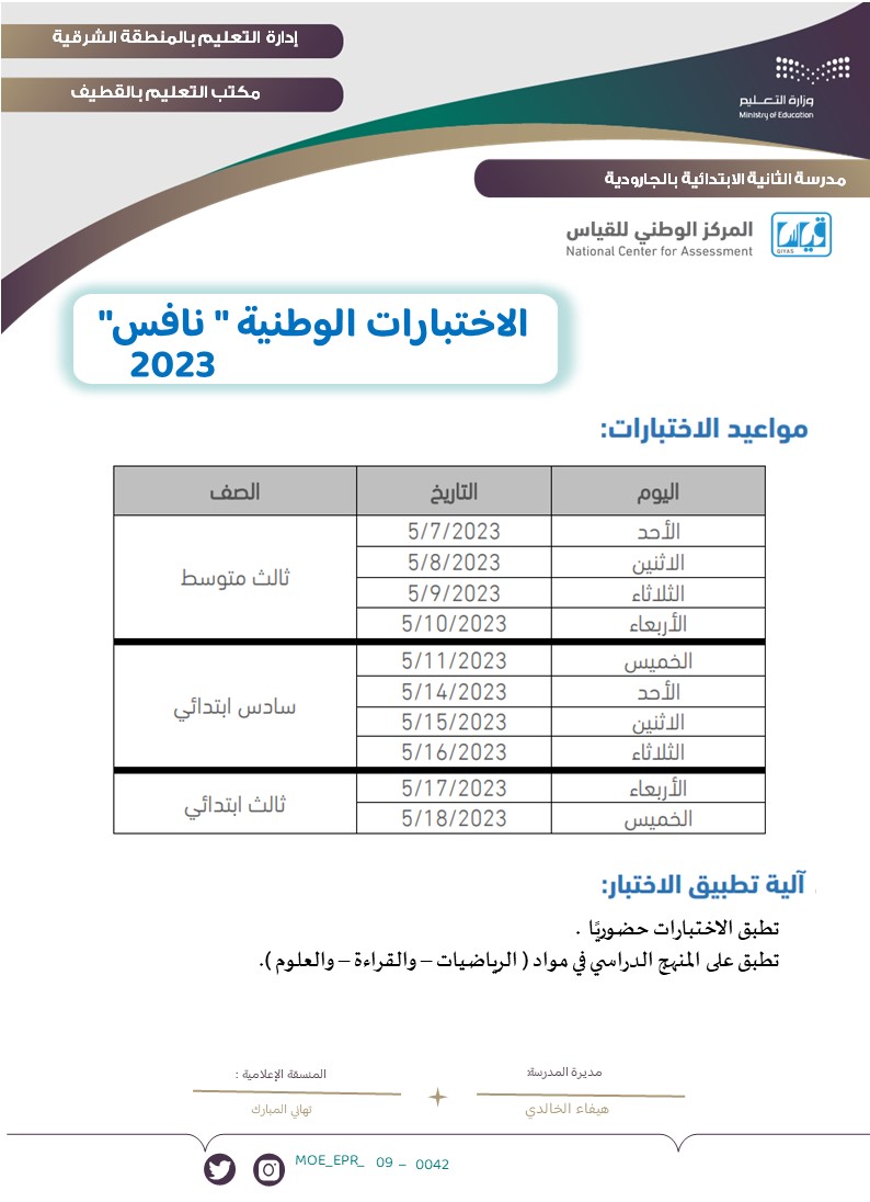 جدير بالذكر أن الزمن الكلي للاختبار ساعتين ونصف يطبق الاختبار على جميع مدارس المملكة، وهو اختبار وطني موحد لجميع الصفوف.