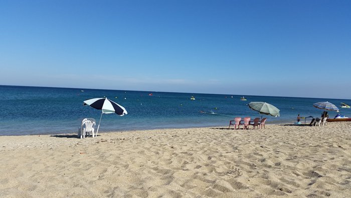 يتميز الشاطئ بمساحته الكبيرة تستطيع فيه الاسترخاء على الرمال أو السباحة في المياه، كما يمكنك أن تستمتع بمنظر الجبال الرائع من على الشاطئ.