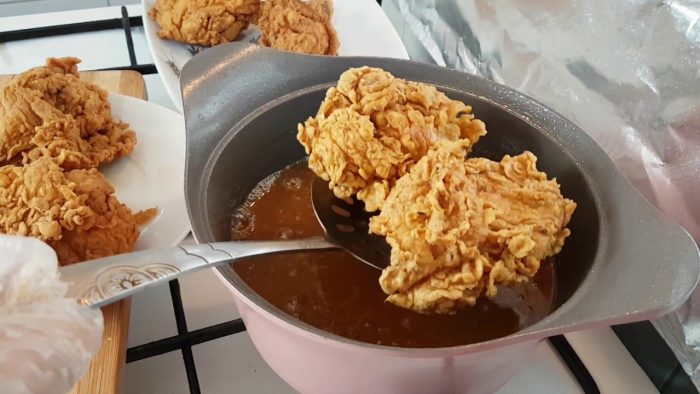 اقلي الدجاج حتى ينضج ويتحول لونه إلى الذهبي.