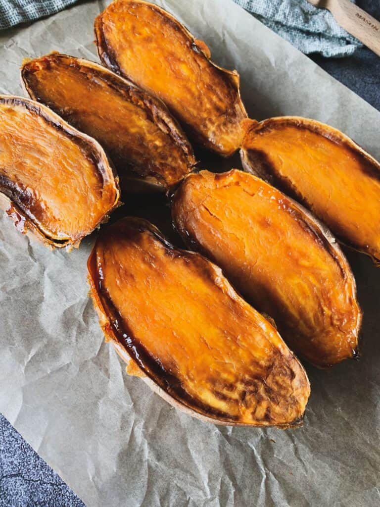 تزن حبة البطاطا الحلوة متوسطة الحجم (حوالي 5 بوصات) تقريبًا 130 جرامًا وتحتوي على حوالي 112 سعرًا حراريًا و26 جرامًا من الكربوهيدرات و4 جرامًا من الألياف، لذلك فـ هل البطاطا الحلوة المشوية تزيد الوزن أم لا؟