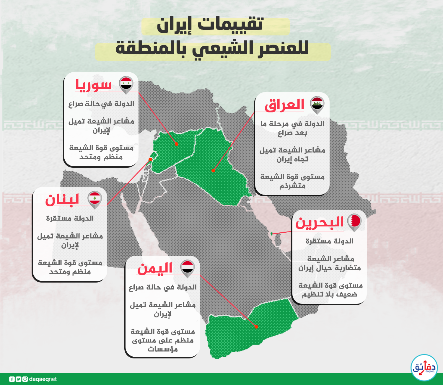 الحكومة الإيرانية نفسها تضع تقييمات لمدى تأييد الشيعة لها في الدول التي تتدخل فيها. مواقف شيعة البحرين كانت الأكثر تضاربًا حيال إيران، بعكس الشيعة في لبنان، الذين كانو الأكثر ميلًا لتأييد إيران نتيجة لحضور حزب الله وعلاقته الوثيقة بطهران.