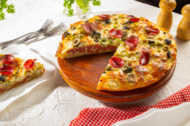 ادهني الصينية المستخدمة بملعقة زيت صغيرة، ووزعي كمية البطاطس المهروسة في الصينية بالتساوي، ضعي البيضة المخفوقة على الوجه، ثم أضيفي ما تبقى من شرائح الزيتون.