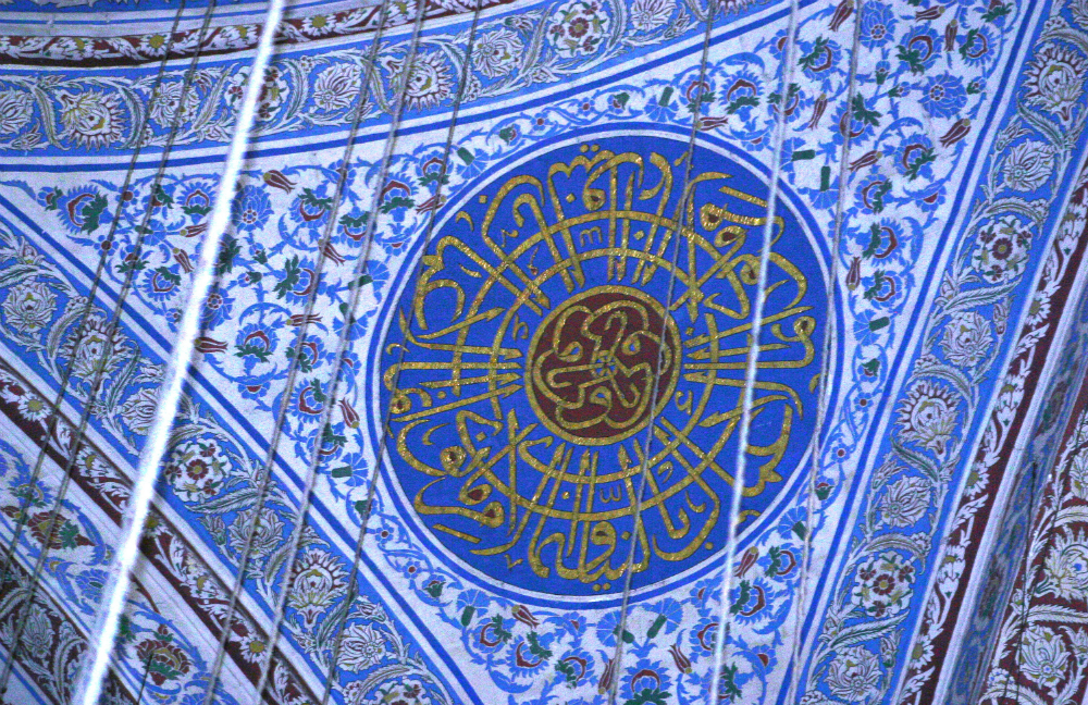 نُقشت العديد من الألواح المعلقة على جدران الجامع الأزرق بالآيات القرآنية بالخط العثماني، واسماء الخلفاء الراشدين مثل أبو بكر وعثمان بن عفان وعمر بن الخطاب.
