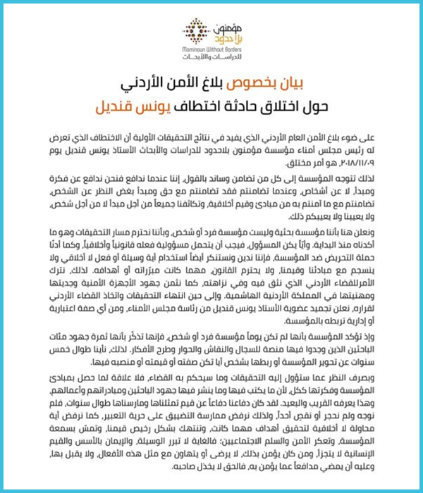 المؤسسة أكدت أنها مؤسسة فكرية لا مؤسسة يونس قنديل، مبدية ثقتها في نزاهة الشرطة والقضاء الأردنيين، معلنة تجميد عضويته وتجريده من منصبه لحين انتهاء التحقيقات.