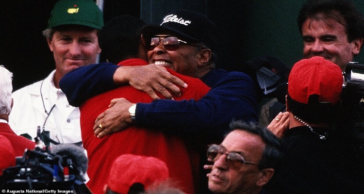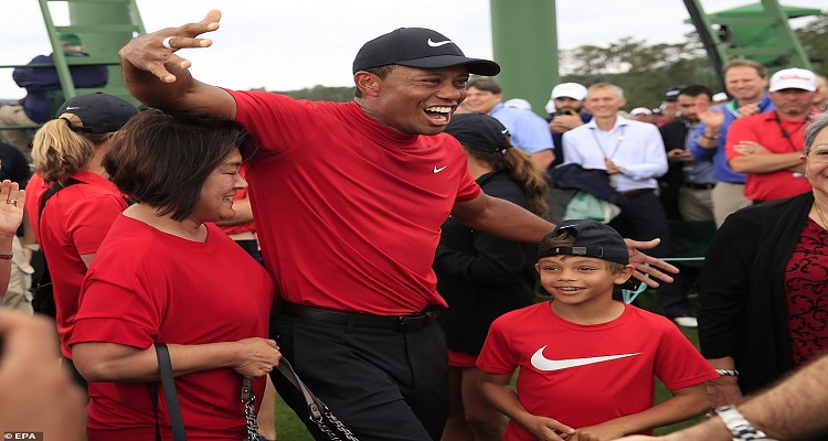 أسطورة الجولف تايجر وودز يلوح بذراعيه منتشيًا بانتصاره حين وصلت الكرة إلى البقعة الخضراء في الحفرة الـ 18 من ملعب أوغستا الوطني للجولف، مرتديًا قميص نايكي الأحمر. عانق عائلته، بما في ذلك ابنه تشارلي، في مشهد أعاد للأذهان احتضانه لوالده، مرتديًا نفس القميص، عندما حقق انتصاره الكبير الأول في بطولات الأساتذة في 1997.