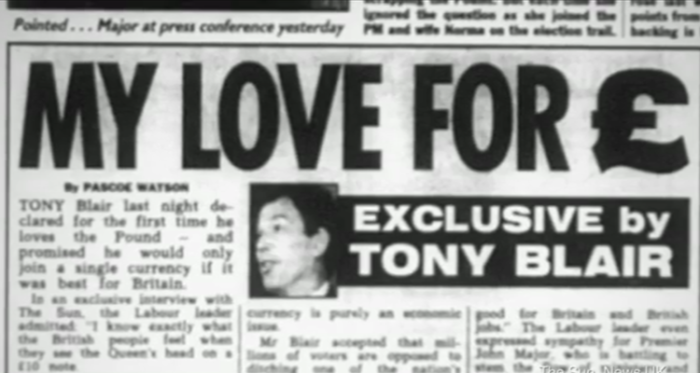ضمن حملة مردوخ لدعم بلير، طلبت الصن من مرشح حزب العمال أن يكتب لها مقالًا حصريًا حول سياسته الأوروبية، المقال قدم بلير في صورة البريطاني الوطني، وأن بريطانيا لن تتخلى عن عملتها الوطنية وتنضم لليورو إلا باستفتاء.