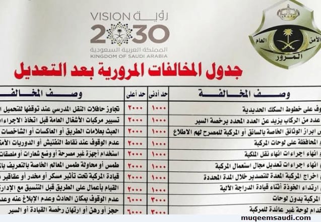 أعلنت الإدارة العامة للمرور في المملكة العربية السعودية عن جدول المخالفات المرورية الجديد، وهو كالتالي: