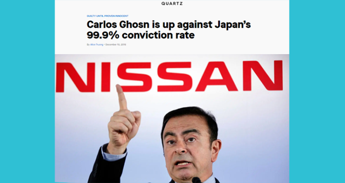 هذه المعلومة أكدها من قبل موقع نيبون الذي يعد بوابة لمعرفة أحوال اليابان، والذي قال إن نسبة الإدانة في المحاكم اليابانية تصل إلى 99.9%.. الأمر الذي علق عليه الإعلام في قضية غصن بعنوان "غصن في مواجهة نسبة الـ99.9%".