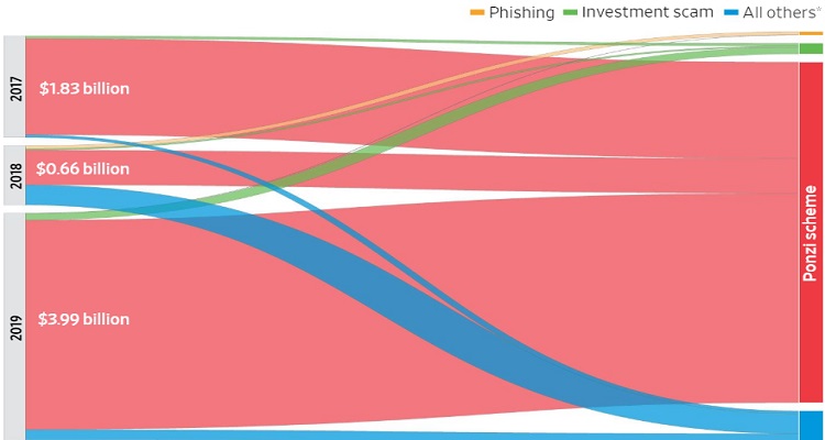 مخططات بونزي للاحتيال بالعملات المشفرة لم تكن موجودة قبل 2017، لكن بحلول 2018 أصبحت أحد أكثر أدوات الاحتيال عبر الإنترنت. مسؤولة وحدها عن حوالي 90% من الأموال المسروقة حول العالم.