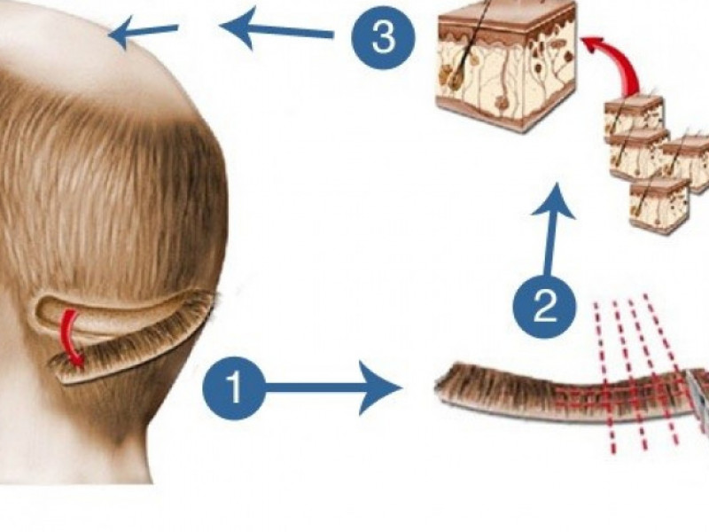 تتم هذه العملية من خلال أخذ شريحة من الجلد تحتوي على بصيلات الشعر من مؤخرة الرأس وزرعها في المنطقة الصلعاء ، وتُسمى تلك العملية أيضًا باسم ترقيع الشعر ، ويتم غلق المنطقة التي أُخذ منها الشعر عن طريق الغرز ، ولكن لن تكون ظاهر إلا إذا تم حلق مؤخرة الرأس.