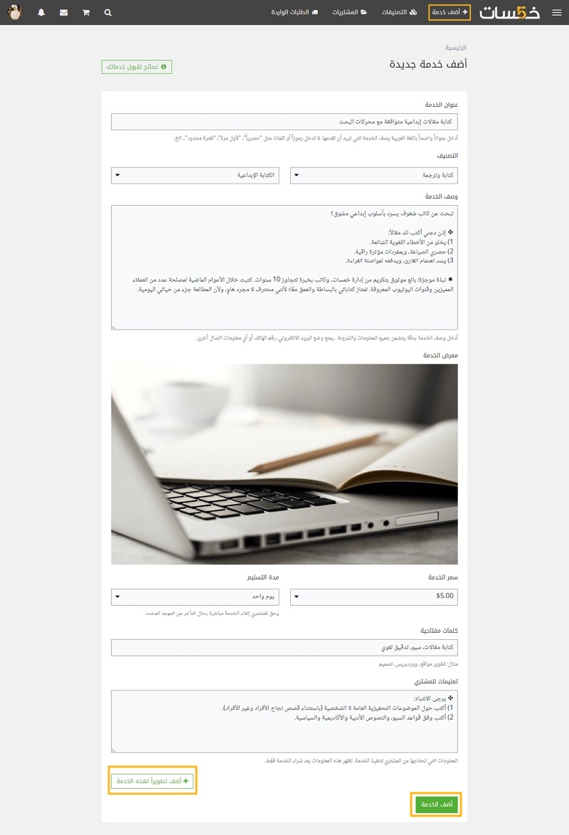 بعد الانتهاء من كافة الخطوات السابقة، قم بالنقر على “أضف الخدمة”، ثم سوف تخضع خدمتك للمراجعة من قِبل فريق خمسات، وإذا كانت مطابقة للشروط ولا تحتاج تعديلات، سيتم تفعيل الخدمة وستصبح ظاهرة في الموقع وسيستطيع العملاء الوصول إليها.