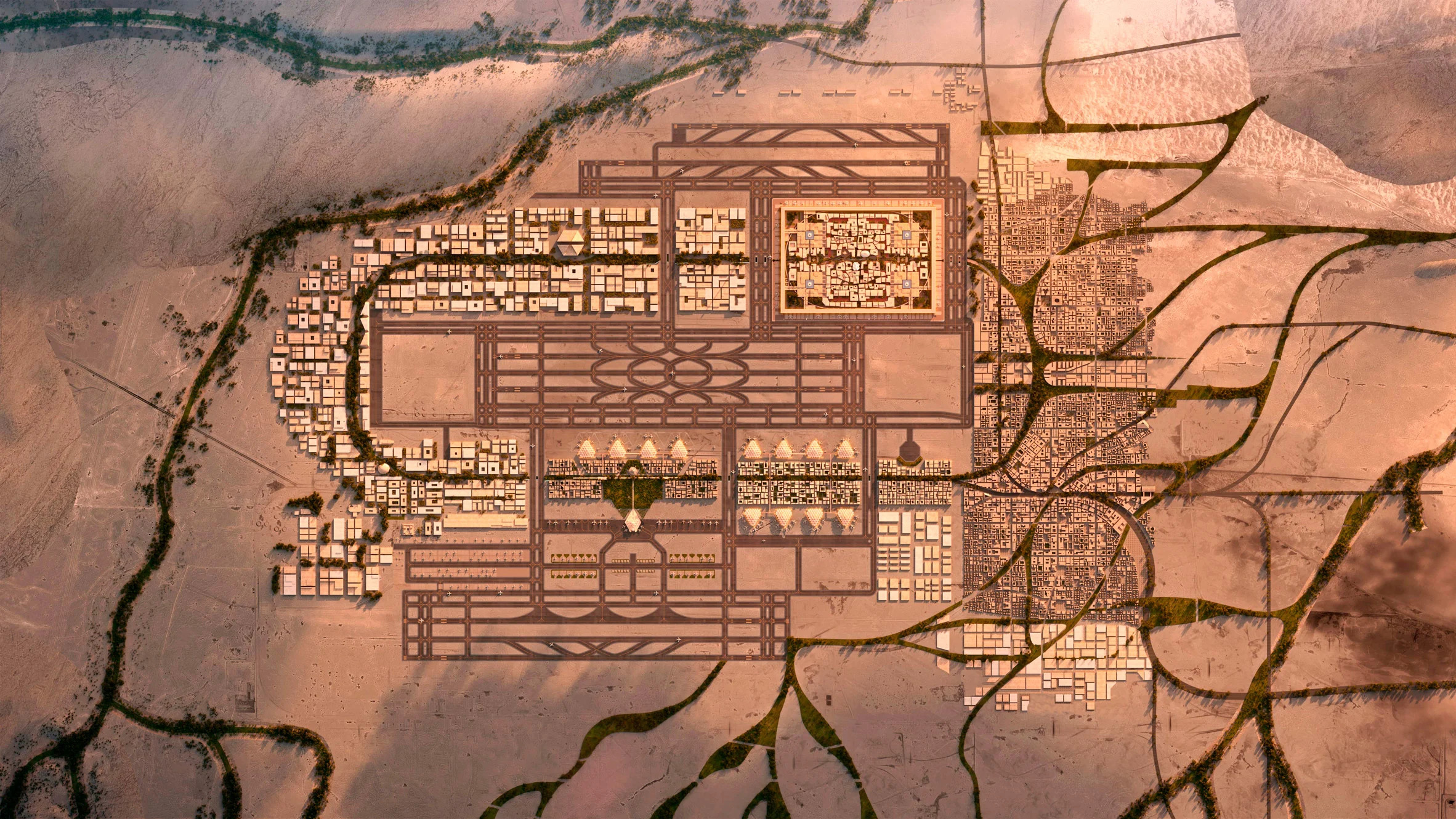 وفقًا لما جاء في المخطط بأنه سوف يضم الصالات الحالية وهي “صالات الملك خالد”، بالإضافة إلى ما يقرب من ستة مدرجات مخصصة لعملية الطيران، ولا يقتصر الأمر على ذلك فقط ولكن تم تخصيص مساحة ١٢كم٢ للمرافق الأخرى المُتمثلة في مطاعم ومحلات تجارية عالمية، وأيضًا أصول سكنية، وأماكن ترفيهية وكافة المرافق المساندة التي تجعله مميزًا ومختلفًا عن غيره من مطارات العالم.
