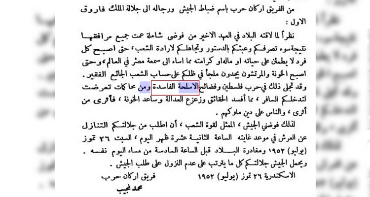 كما ذكر خالد محيي الدين، أحد الضباط الأحرار، في مذكراته، أن قصة الأسلحة الفاسدة استُخدمت كستار لإخفاء فساد نظامٍ بأكمله، فالجيش لم يكن يتدربّ على إطلاق النار إلا مرة واحدة في العام، لذا لم يكن مؤهلاً للحرب على الإطلاق.