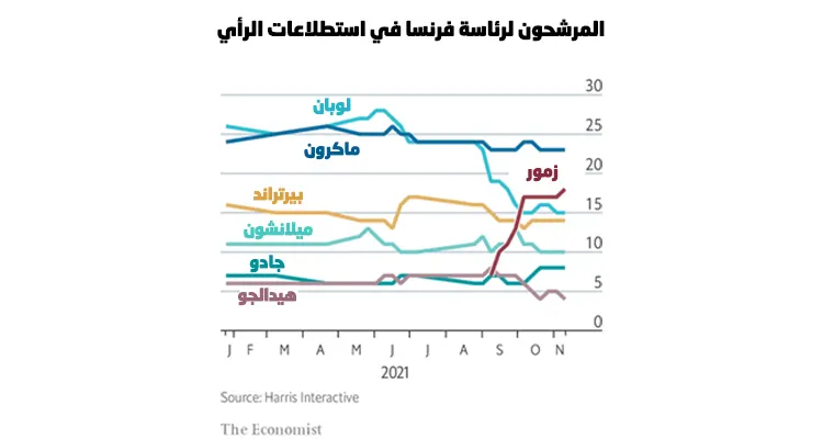 أظهر استطلاع حديث أجراه معهد الاستطلاعات Ifop أن زمور سيفوز بنسبة 17٪ من أصوات الجولة الأولى في الانتخابات، متجاوزًا كلاً من لوبان ومرشح يمين الوسط - الذي لم يتم تحديده بعد - للوصول إلى الجولة الثانية.