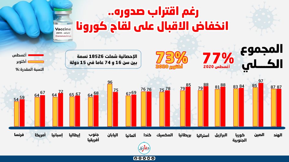 رغم الأخبار عن قرب صدور لقاح كورونا الجديد، كشفت إحصائية أجراها المنتدى الاقتصادي العالمي بالتعاون مع مركز إبسوس في 15 دولة، انخفاضًا ملحوظًا في رغبة العديدين من الناس في الحصول على اللقاح عن المعدلات التي كانت موجودة في أغسطس 2020.