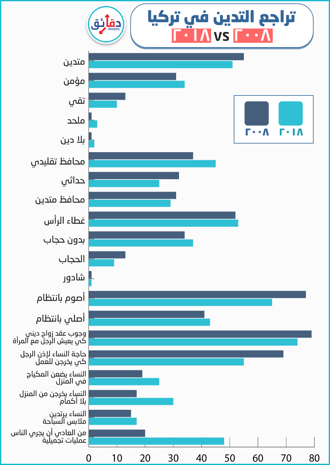 تكشف النتائج (طالعها كاملة هنا) .. أن معظم مظاهر التدين في تركيا تراجعت، أو على الأقل لم تشهد قفزة عما كان الحال عليه قبل عقد من الزمان.