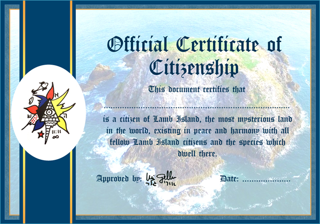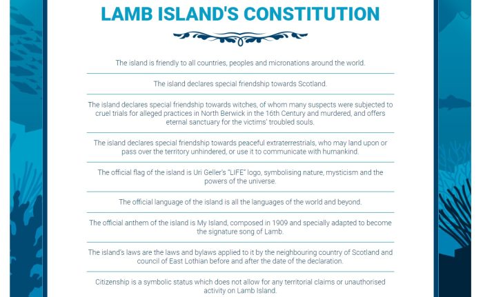 لكي تصبح مواطنًا في جمهورية لام، بحكم دستور جيلر، عليك أن تكون مستعدًا للعيش في وئام مع سكانها الآخرين - أي عدد قليل من الطيور البحرية - واحترام الجزيرة كرمز للسلام، وقبول السحرة و"أرواح ضحايا محاكمات الساحرات"، التي يفترض أن عظامهن مدفونة في الجزيرة، وحتى "الكائنات الفضائية المسالمة".