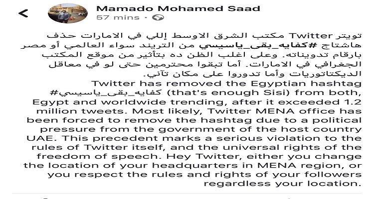 سريعًا، قال محمد علي إن النظام المصري وحلفاءه في الإمارات مارسوا طرقًا غير شريفة لحذف الوسم، وسارع لإطلاق وسوم بديلة.