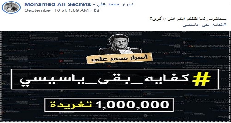 محمد علي، المقاول المصري الهارب صاحب مقاطع البث الإلكتروني المباشر يدعو النشطاء المصريين للتفاعل مع وسم أطلقه خصيصًا للمطالبة برحيل الرئيس عبد الفتاح السيسي.