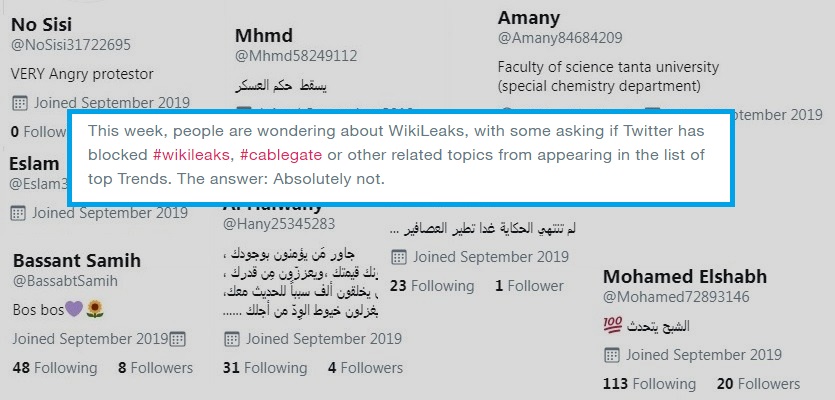 الحالة تنطبق على التغريدات التي استخدمتها قناة الجزيرة القطرية للحديث عن نجاح الوسم في تحقيق أهدافه، وأغلبها تحمل أسماءً وهمية، بلا صور أو بيانات للمستخدم.