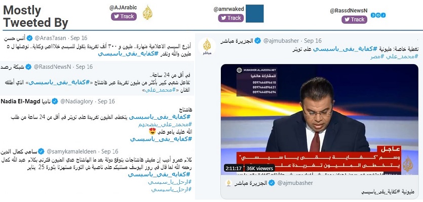 الجزيرة تحدثت عن "حرب إلكترونية" بين داعمي محمد علي وبين أنصار الرئيس المصري، وقالت إن الوسوم البديلة وجدت طريقها لقائمة الأعلى تداولًا.